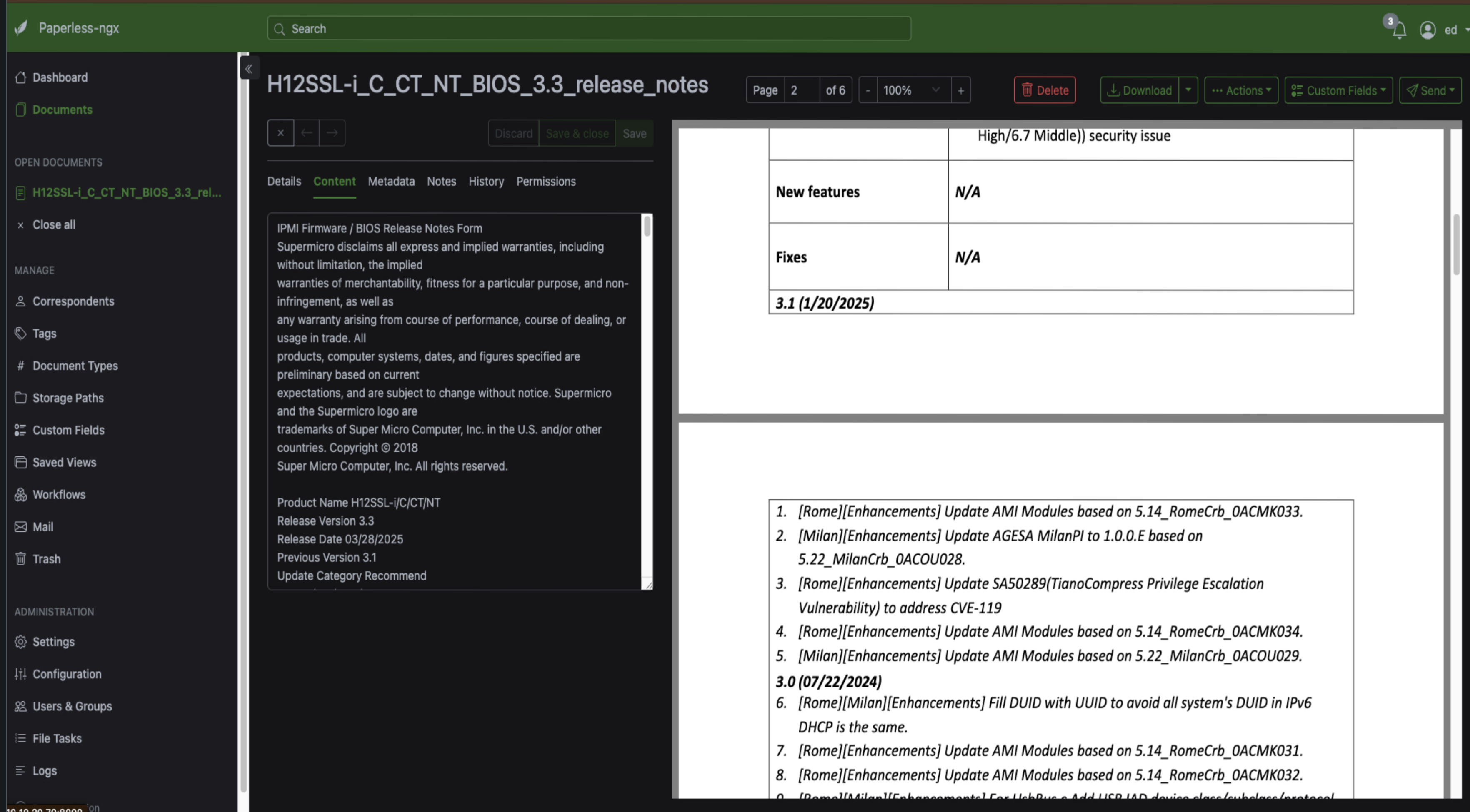 Try dragging a PDF into the web UI. You'll see it upload, and once it's done, click to open the document. In the screenshot below I've used a motherboard manual as an example. You'll see the document viewer with all the details on the side. Click the content tab and you'll see all the text that Paperless extracted from the document using OCR.
